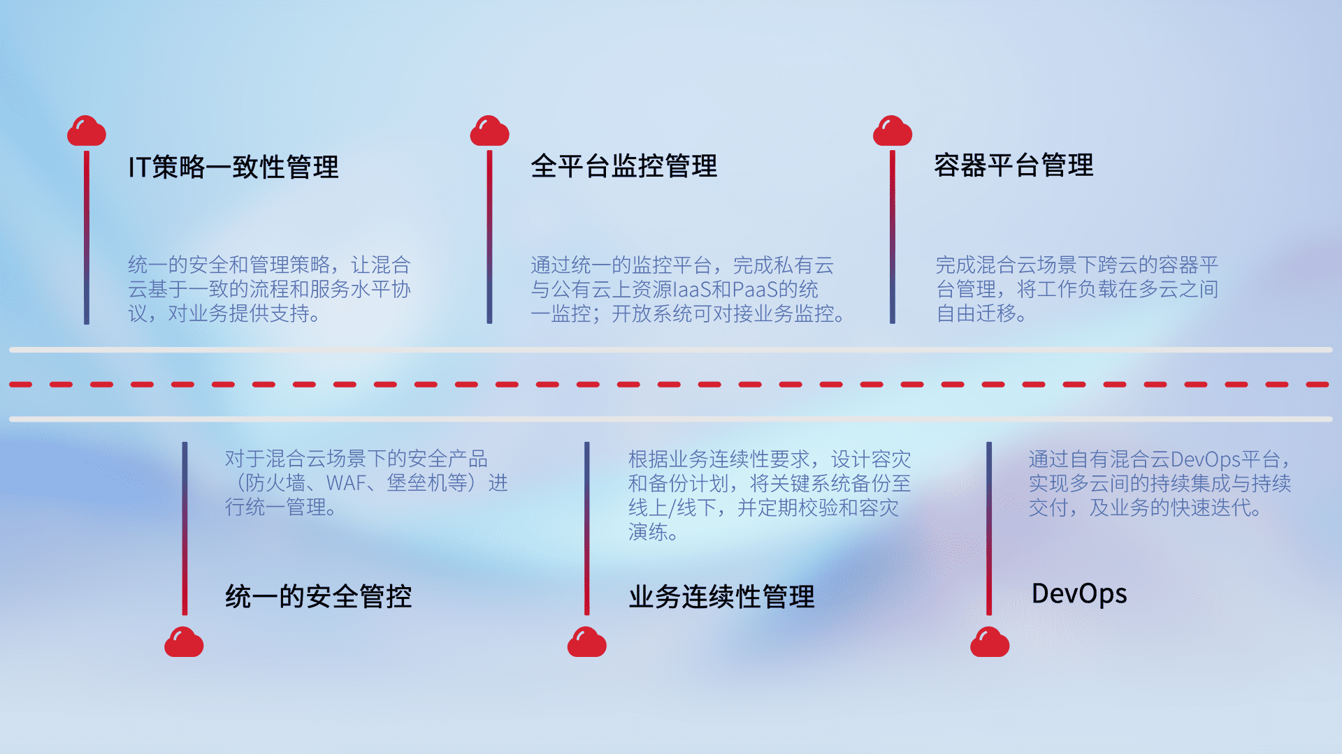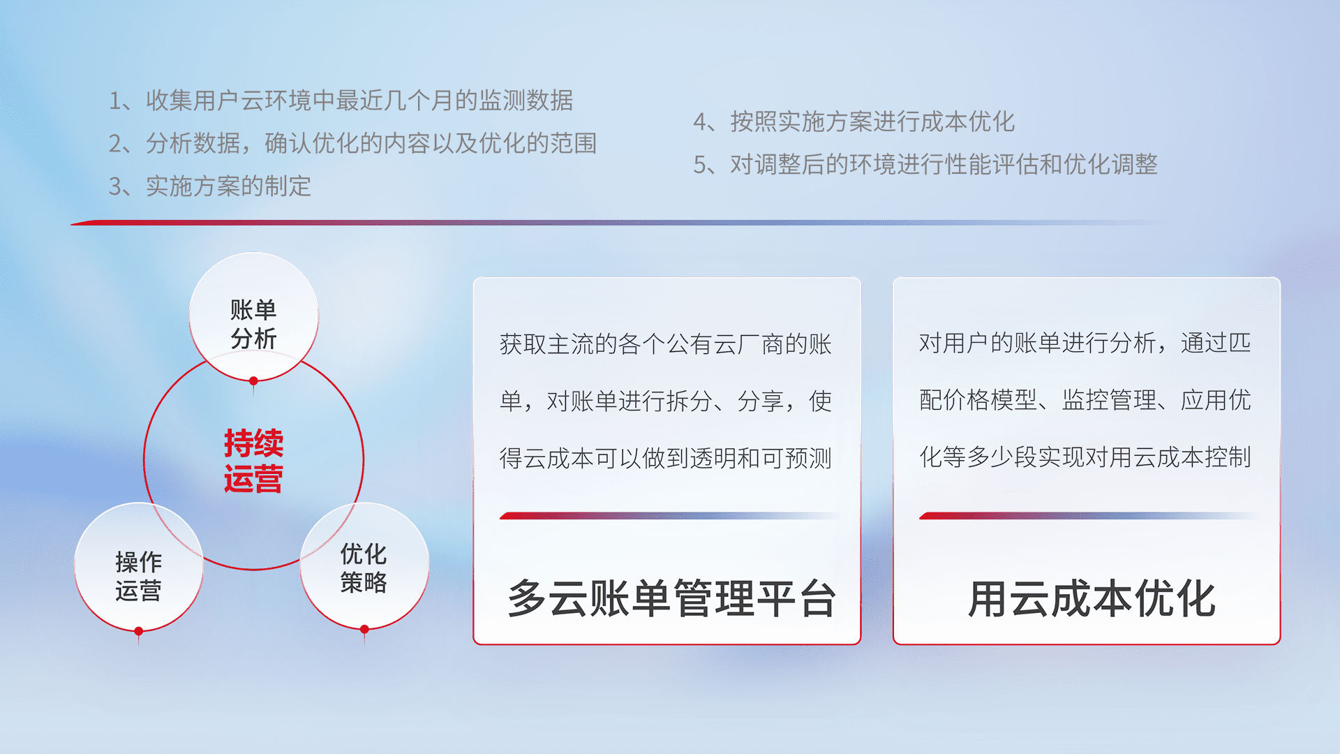 通过多云纳管,,,以统一的资源数据模型把客户的云资源进行抽象和封装,,,,进而实现对多云资源的统一操作,,保障云资源管理的可靠性、、、、稳定性与可用性。。。量身定制化运维内容,,配置、、开发运维、、、补丁管理、、、、备份、、、监控、、、、认证和访问管理、、、审计和日常巡检等,,保障在用云过程中的可靠度,,,稳定度以及高可用率。。。。