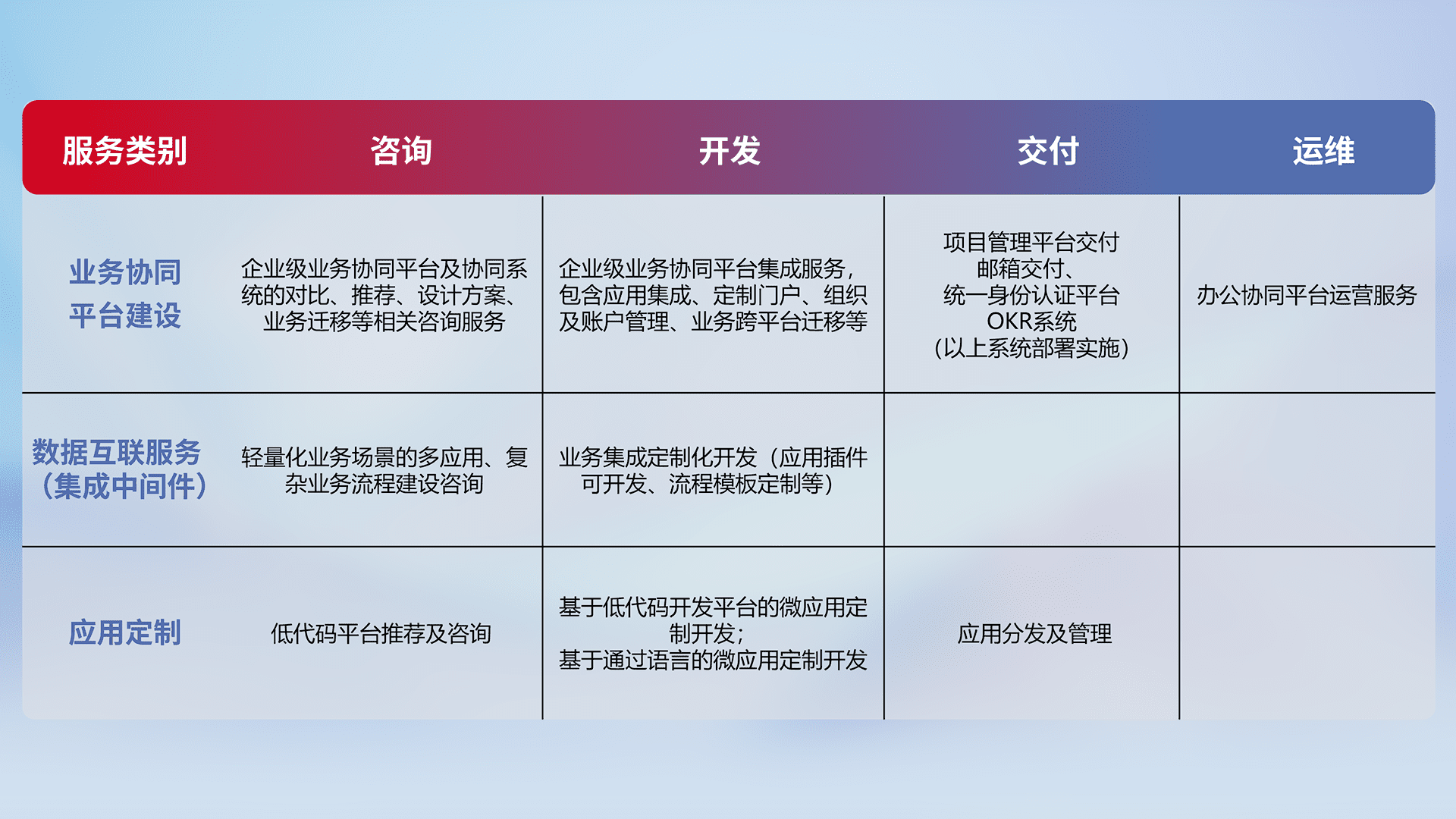 针对钉钉、、企微、、、、IDaas等平台级产品提供产品的规划、、、方案、、、交付、、定制化开发等服务,,,,实现如统一协同办公、、智能客户服务、、、混合会议管理、、、、智能数据查询、、等业务场景,,,,实现数字化转型。。。。